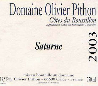 The 2003 Domaine Olivier Pithon Cotes du Roussillon Villages "Saturne" managed to cover two WBW themes in one bottle, since it's a biodynamic wine from the Cotes du Roussillon ($19.50, Red Carpet Wine Shop; available from other merchants for between $20 and $30). Like many wines from the south of France, this Pithon bottling was made from a blend of grenache, carignan, and syrah and had a deep, inky purple color. Either because it was made biodynamically or because it was from the Languedoc-Roussillon, I didn't find it was as aromatic as a Rhone wine made with these varietals. Still, there was loads of plummy fruit and some anise on the palate with a decided streak of minerality. This is what I associate most with biodynamic wines: a long mineral note that extends from the aromas through the last drops in the glass and beyond. Good QPR, especially for the price that I paid for it, though I would have liked it to have a little more balance between the fruit and the mineral notes.